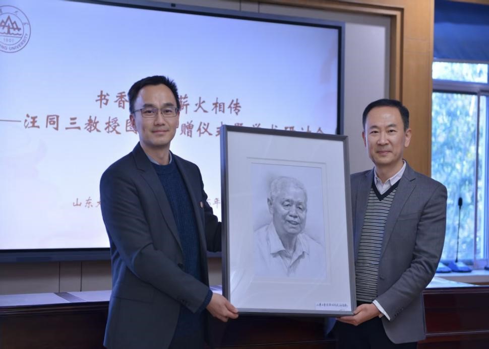 经济学院党委书记朱子川代表学院接受捐赠,并回赠山大学子精心绘制的汪同三教授肖像画。经济学院、自拍偷拍